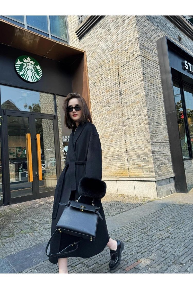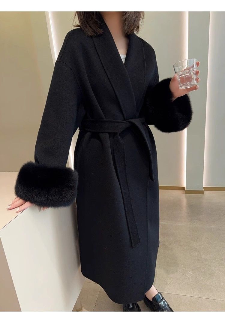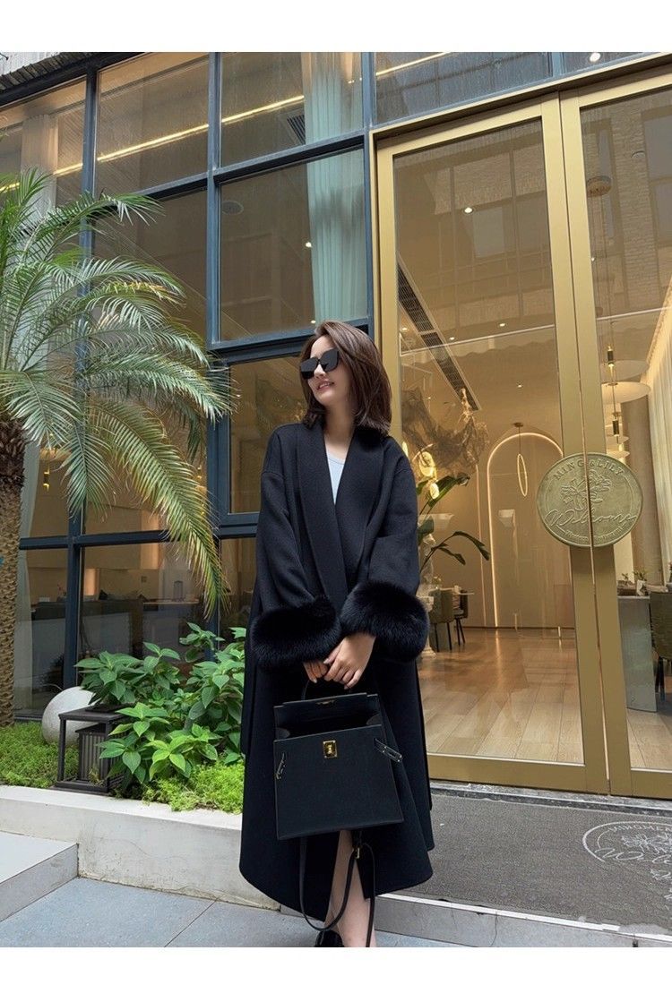 Wool Coat For Women Mid-length Black With Fox-fur Cuffs